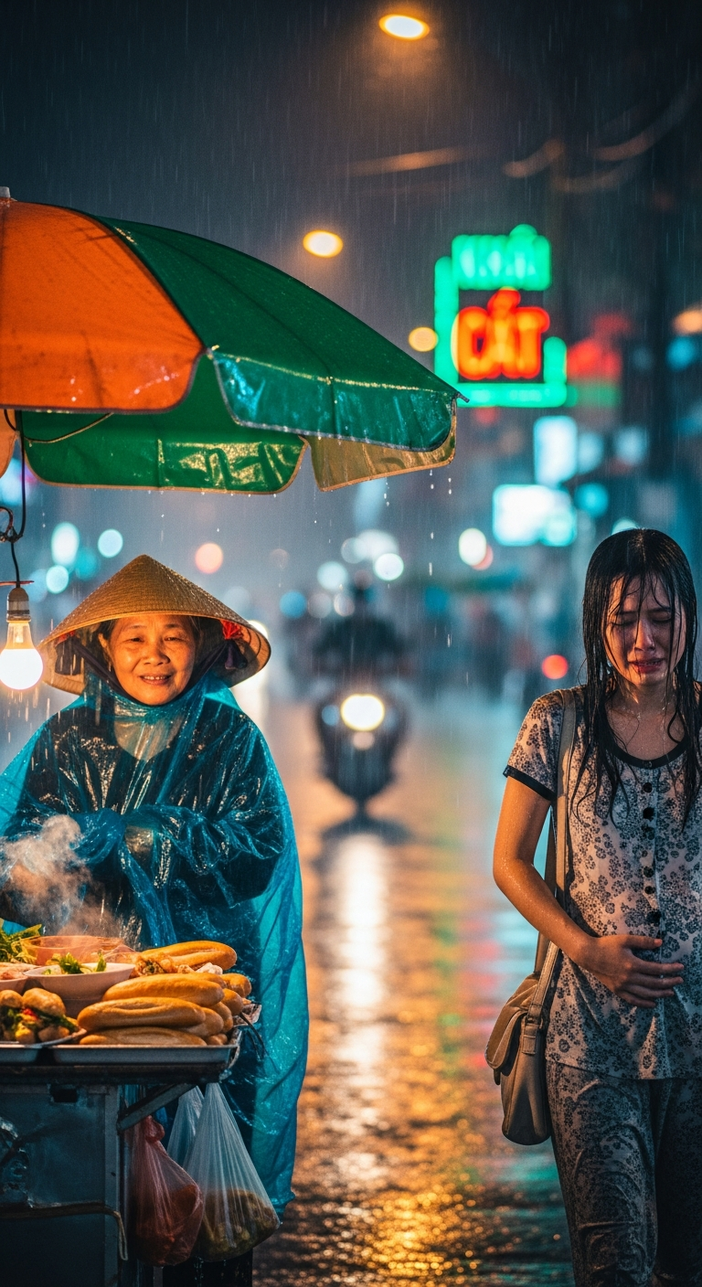 Cô gái nhìn bà, mắt rưng rưng. Bà Tư dọn đồ, tắt bếp, rồi cùng cô đẩy xe bánh mì về. Con hẻm nhỏ loang ánh đèn vàng, nước mưa rơi lộp độp lên mái tôn, tiếng bánh xe lăn trên nền gạch nghe buồn như một bản nhạc cũ.
